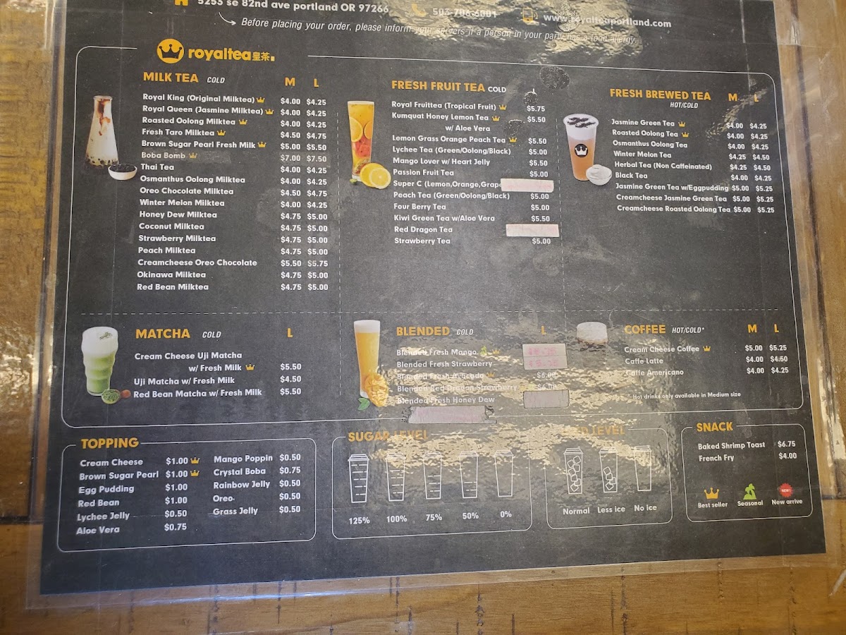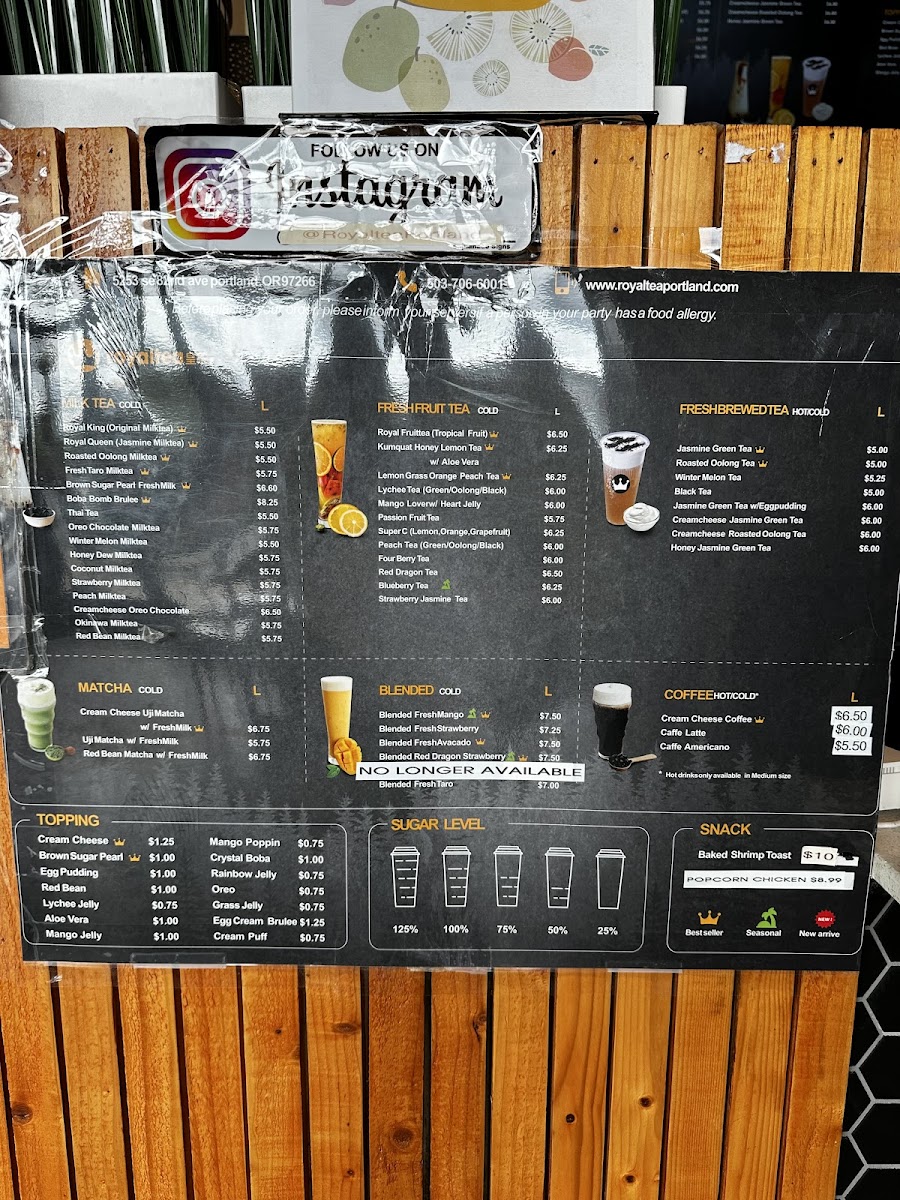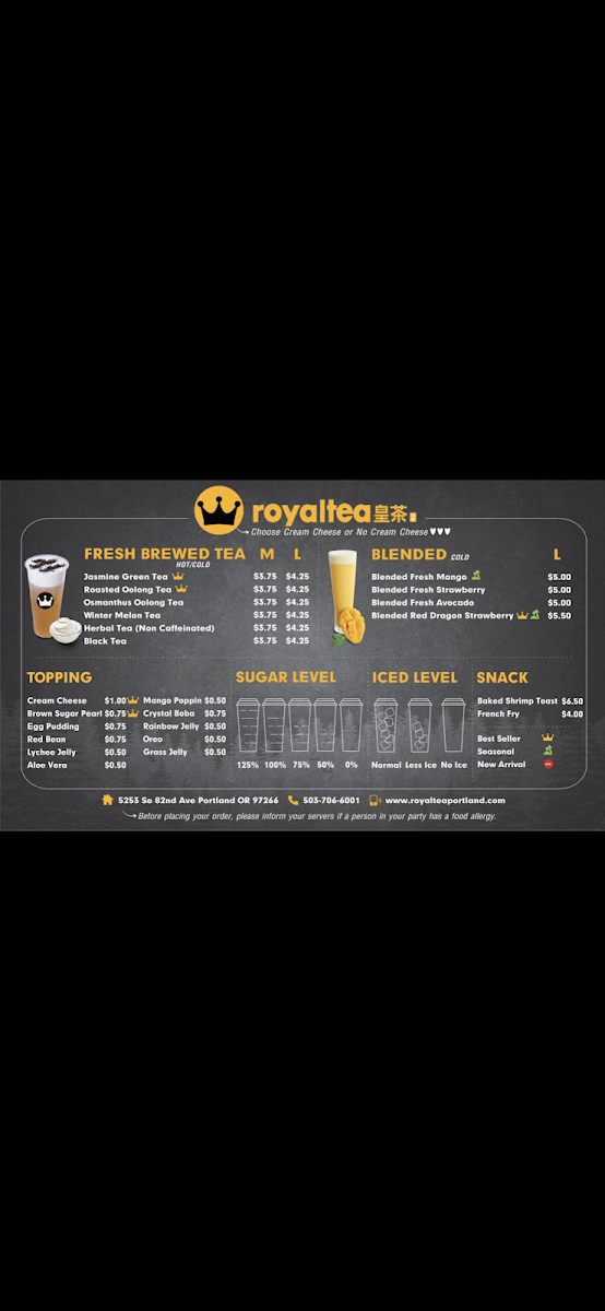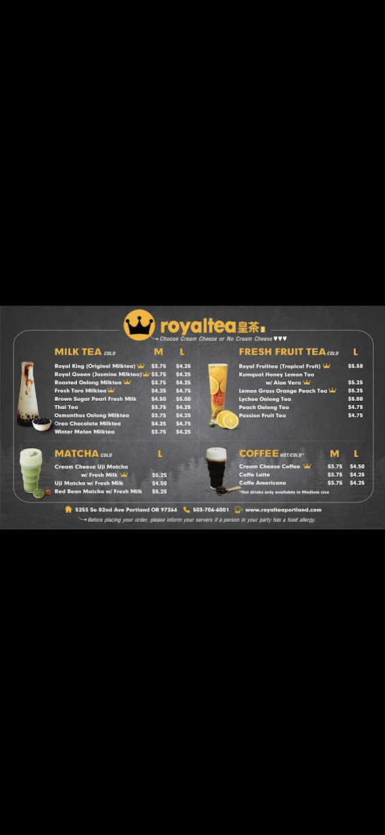 At Royaltea Portland, the menu offers a delightful array of beverages and snacks that cater to diverse tastes. For those craving something refreshing, the Fresh Fruit Tea selection features options like the tangy Lemon Grass Orange Peach Tea and the tropical Mango Lover with Mango Jelly. Snack lovers can indulge in crispy Popcorn Chicken, savory Saigon Hacao, or try the sweet and cheesy Cheese Coin Waffle (2 per order). If you're in the mood for something lighter, the Shrimp Tempura (10 pieces) or the indulgent Caramel Flan are perfect choices. The coffee menu is equally inviting, with options such as the creamy Cream Cheese Black Coffee and the rich Vietnamese Milk Coffee. Milk tea enthusiasts can savor flavors like the smooth Peach Milktea or the decadent Creamcheese Oreo Chocolate. For something more unique, the Boba Bomb or the Honey Dew Milktea offers an exciting twist. The Blended drinks are a true treat, with options like Blended Fresh Strawberry and Blended Fresh Mango to satisfy any sweet tooth. Matcha lovers will appreciate the Cream Cheese Uji Matcha or the earthy Red Bean Matcha with Fresh Milk. Lastly, the Fresh Brewed Tea choices like Jasmine Green Tea and the unique Creamcheese Roasted Oolong Tea round out a well-rounded menu for every craving.