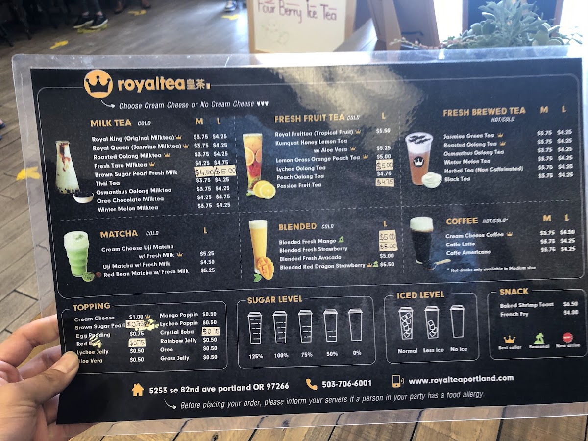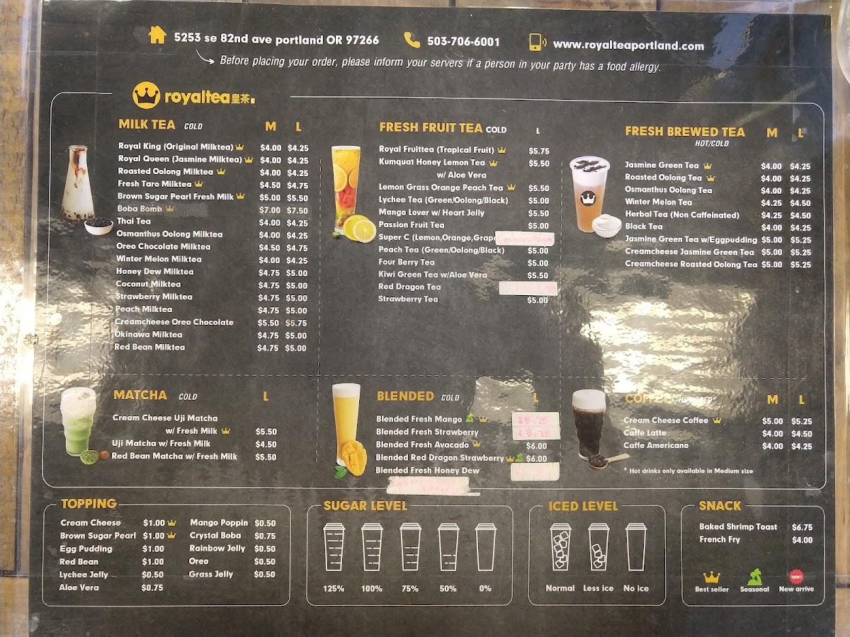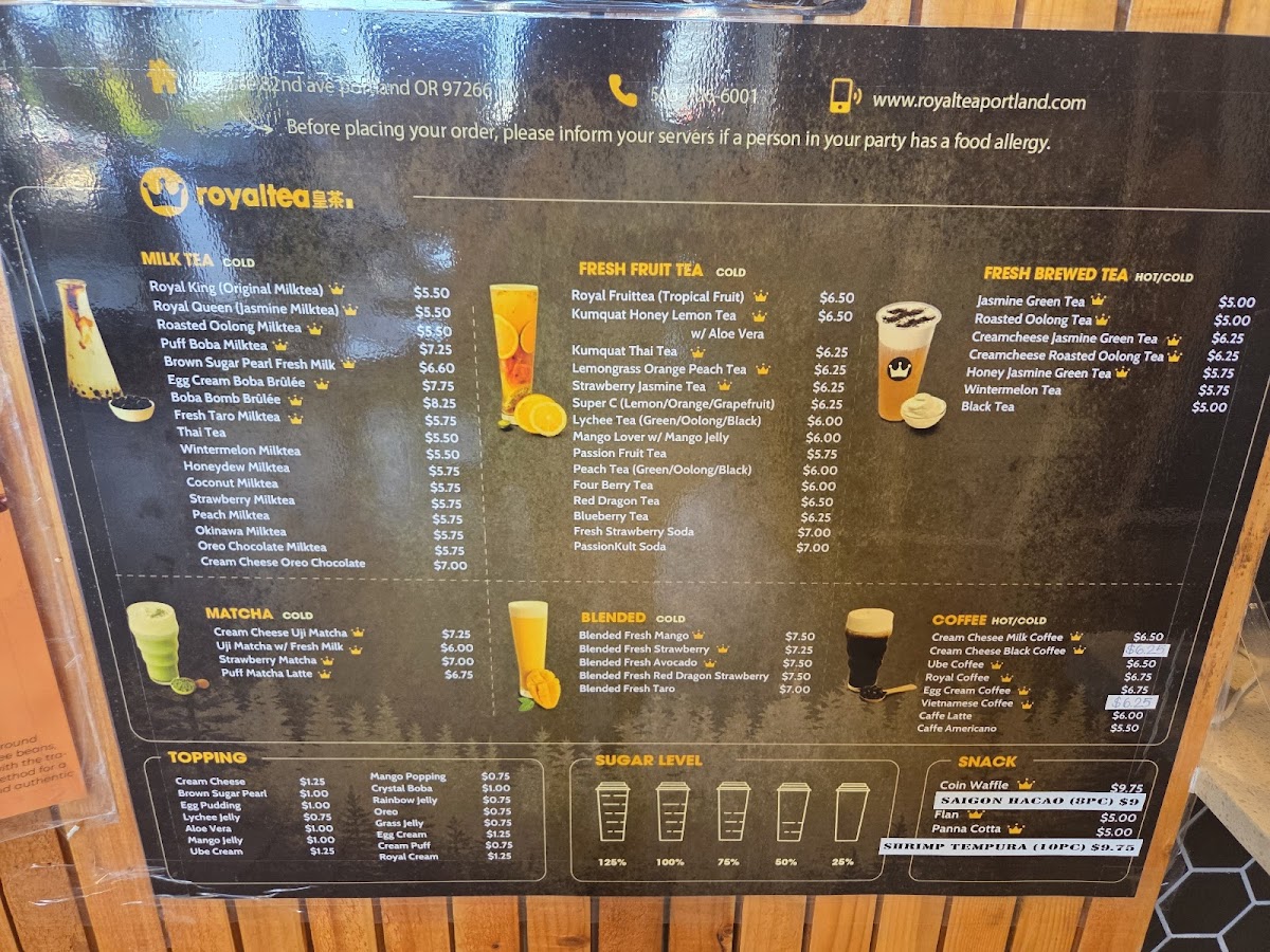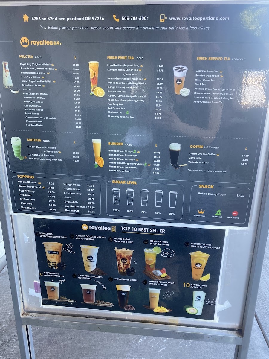 At Royaltea Portland, the menu offers a delightful array of beverages and snacks that cater to diverse tastes. For those craving something refreshing, the Fresh Fruit Tea selection features options like the tangy Lemon Grass Orange Peach Tea and the tropical Mango Lover with Mango Jelly. Snack lovers can indulge in crispy Popcorn Chicken, savory Saigon Hacao, or try the sweet and cheesy Cheese Coin Waffle (2 per order). If you're in the mood for something lighter, the Shrimp Tempura (10 pieces) or the indulgent Caramel Flan are perfect choices. The coffee menu is equally inviting, with options such as the creamy Cream Cheese Black Coffee and the rich Vietnamese Milk Coffee. Milk tea enthusiasts can savor flavors like the smooth Peach Milktea or the decadent Creamcheese Oreo Chocolate. For something more unique, the Boba Bomb or the Honey Dew Milktea offers an exciting twist. The Blended drinks are a true treat, with options like Blended Fresh Strawberry and Blended Fresh Mango to satisfy any sweet tooth. Matcha lovers will appreciate the Cream Cheese Uji Matcha or the earthy Red Bean Matcha with Fresh Milk. Lastly, the Fresh Brewed Tea choices like Jasmine Green Tea and the unique Creamcheese Roasted Oolong Tea round out a well-rounded menu for every craving.